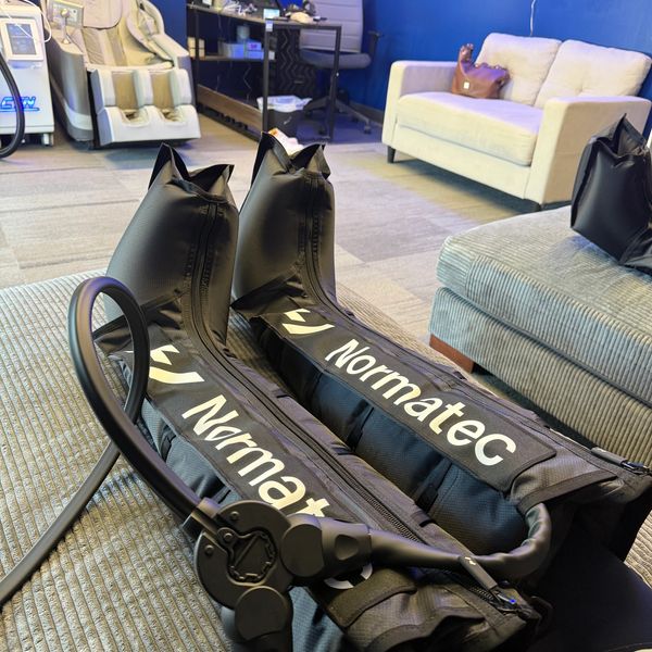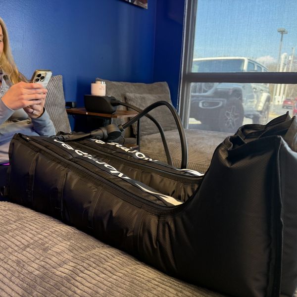 Compression therapy uses air pressure sleeves that rhythmically massage the legs or hips to improve circulation and reduce muscle fatigue.